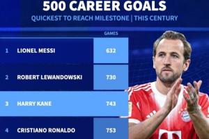 本世纪解锁生涯500球场次:梅西632场最快 莱万730场第二凯恩第三