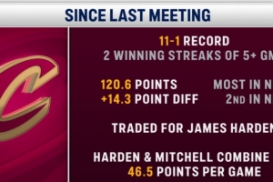 骑士近12场11-1&场均净胜14.3分 哈登&米切尔搭档场均合砍46.5分